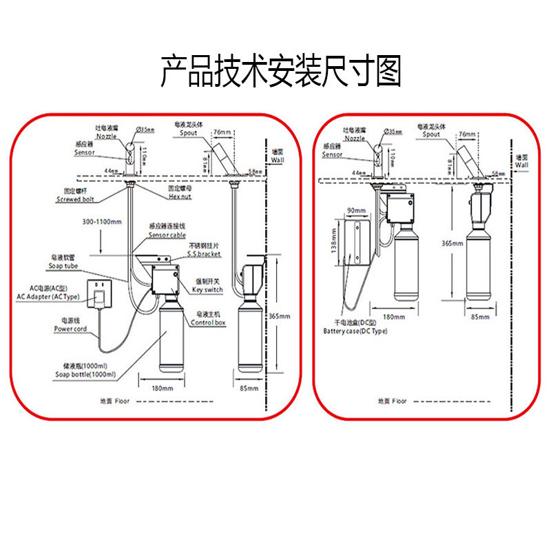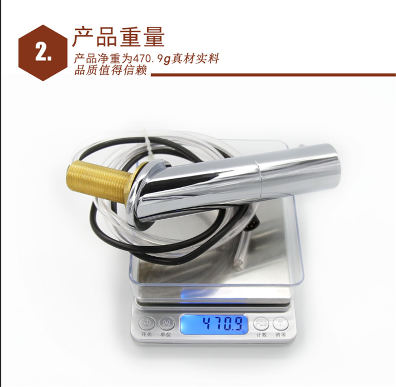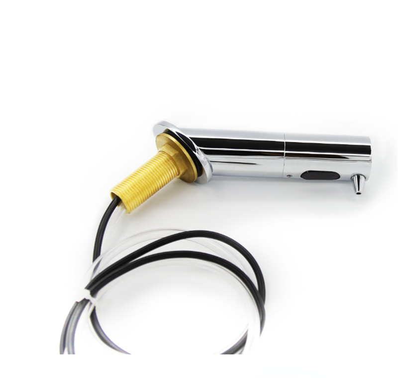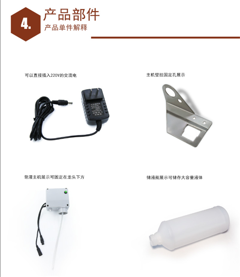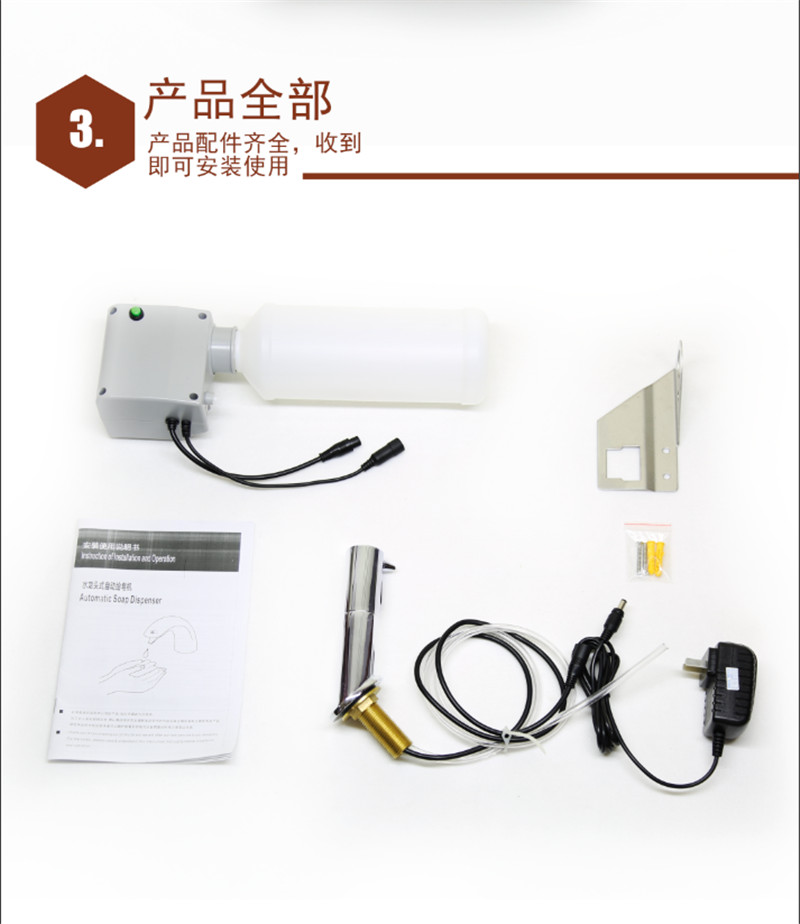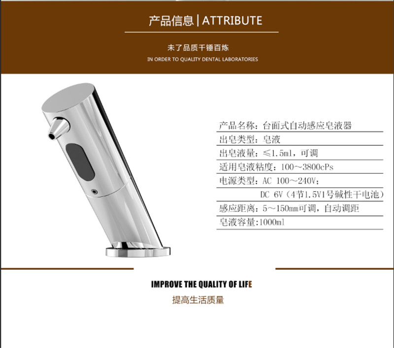产品采用红外线自动感应技术,能自动感应出皂液。每次定量给皂器,能避免洗手液的浪费。产品使用水龙头式安装,能保证多余的洗手液都是掉到台盆里面避免普通皂液器皂液滴在台面上脏和腐蚀台面的情况。